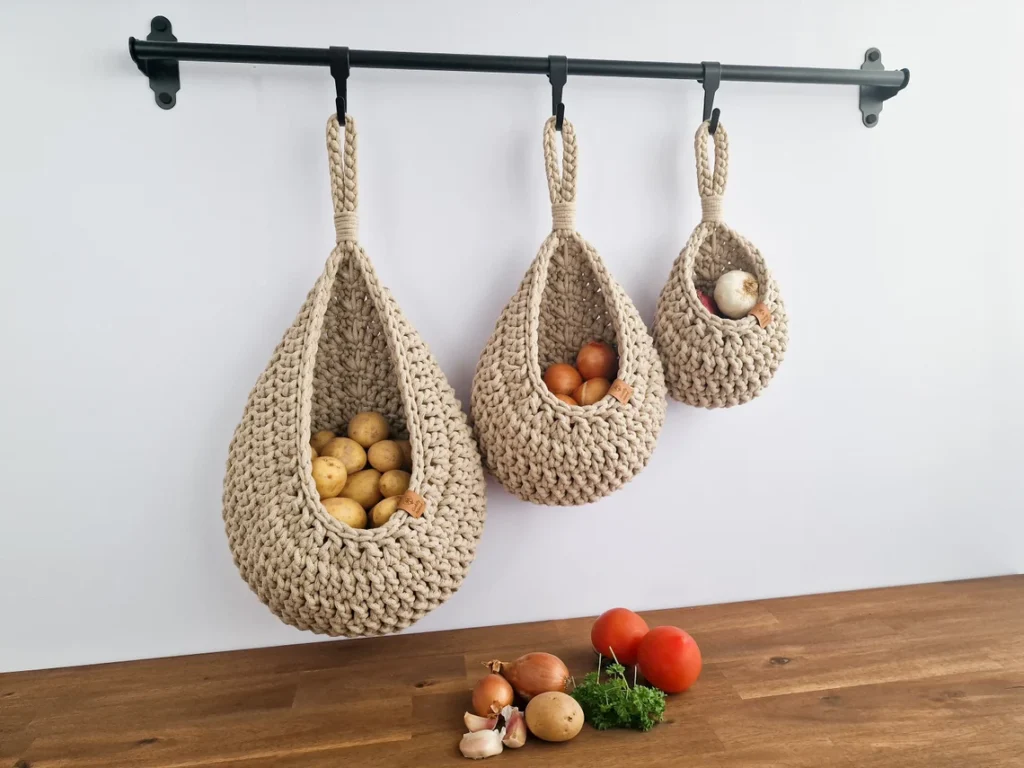 Crochet Hanging Basket: Kitchen Vegetable Storage, Boho Home Decor